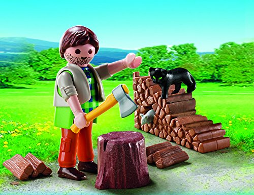 Presenta un uomo con ascia, ceppo d'albero e mucchio di legno tritato