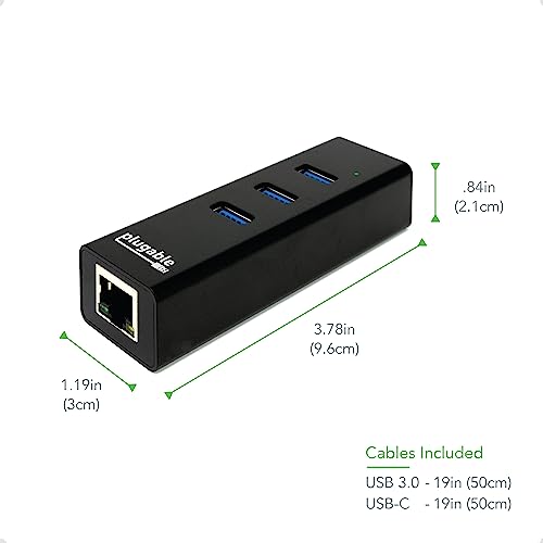Plugable USB 3.0 Hub portatile con Ethernet - 3 porte USB 3.0 Hub USB alimentato con Gigabit Ethernet per Windows, MacBook, Linux, Chrome OS (include cavi per sistemi USB C e USB 3.0)