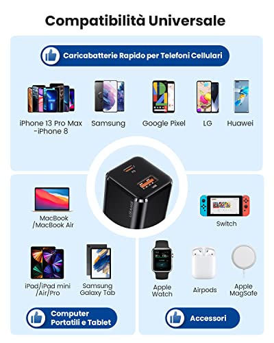 design con una porta USB-A + una porta USB-C e voltaggio universale 100-240 V in tutto il mondo, questo caricabatterie rapido USB è perfetto per l'ufficio e i viaggi!
