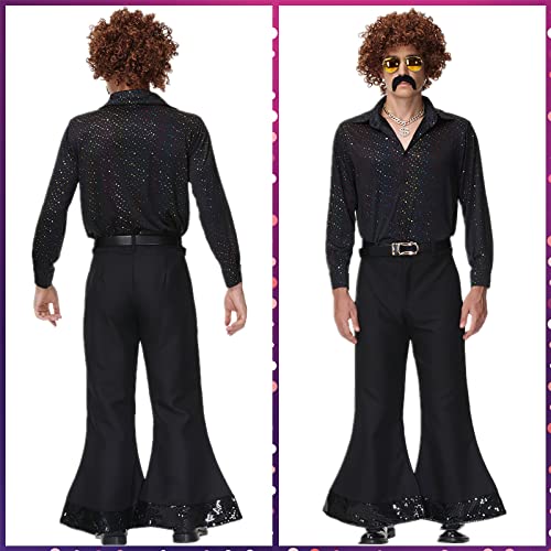 PLULON 9 pezzi Discoteca uomo anni '70 Costume Dude Camicia paillettes Set pantaloni fondo a campana occhiali sole parrucca Accessori discoteca anello a catena con simbolo del dollaro e baffi