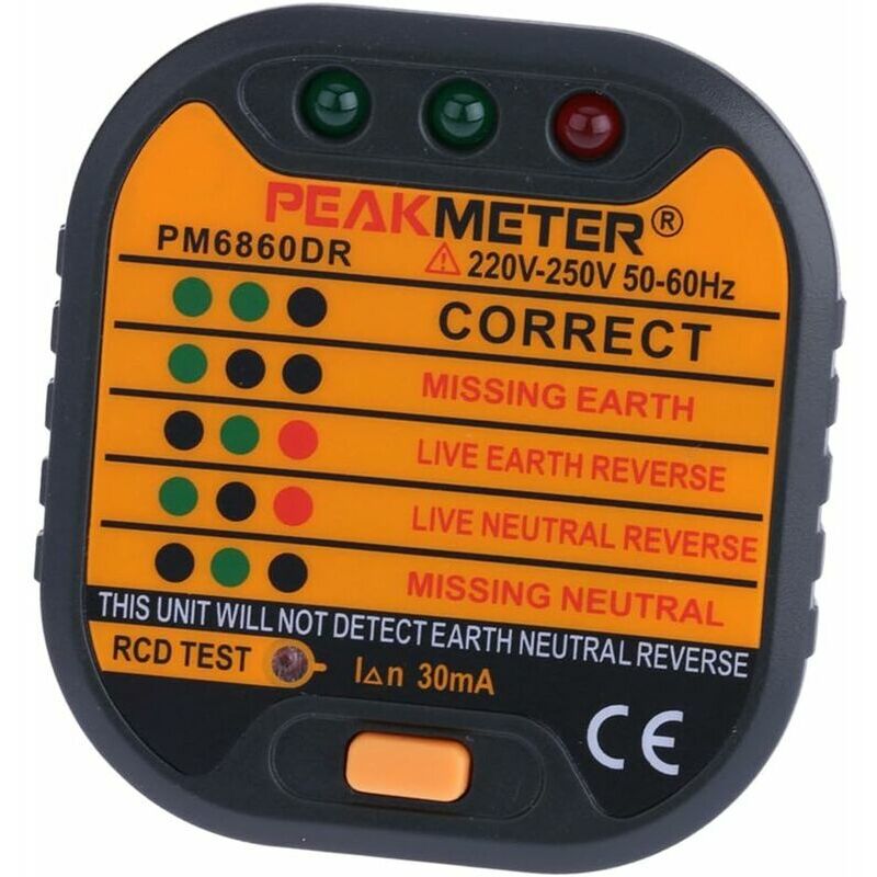 PEAKMETER PM6860DR Tester automatico per prese elettriche - Tester avanzato per prese per rilevare rapidamente se la connessione del cavo è corretta o meno. Funzione di sgancio GFCI/RCD integrata, ti protegge dal rischio di scosse elettriche. Facile da usare: rileva se il filo neutro, di fase e di terra è collegato correttamente e indica quale filo manca con schemi luminosi chiari . Luce LED brillante e 3 indicatori di test - I modelli di luce sono ben etichettati sulla superficie del tester per prese. Facile e veloce da leggere il risultato del test. 5 modelli di luci a LED - Con 5 indicatori di facile lettura per mostrare lo stato della presa, facile da giudicare: buono, terreno mancante, ritorno del terreno vivo, ritorno al neutro, neutro mancante. Garantire la sicurezza elettrica domestica, perfetto per casa, lavoro e circuito. specifiche: Tipo di spina: standard europeo Tensione: 220 V +/- 10 V Sono 30 mA La confezione include: 1 pezzo PEAKMETER PM6860DR Tester automatico per