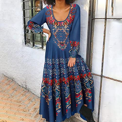 PMDKLSPQ Abito asimmetrico, da donna, a maniche lunghe, maxi abito in cotone, con scollo rotondo svasato e stampa etnica, abito estivo da donna, Blu, XL