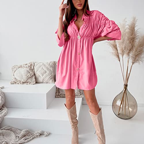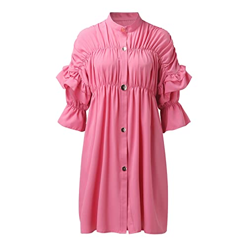 PMDKLSPQ Mini abito estivo rosso da donna con maniche larghe, casual, con bottoni, fiore, da donna, per il tempo libero, colore nero, a maniche lunghe, stretto, estivo, scollo a V, Colore: rosa., M