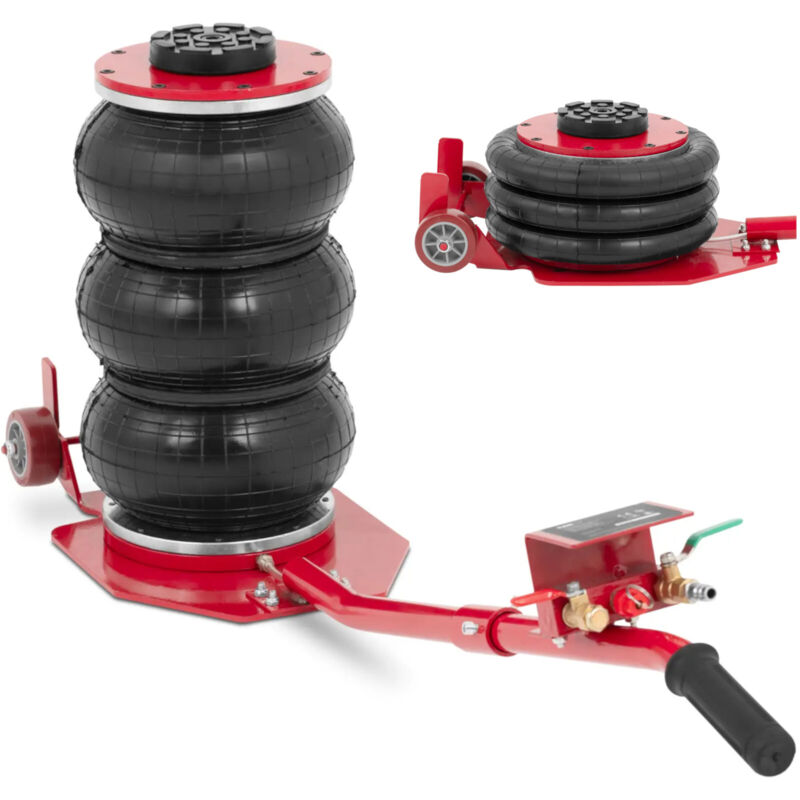 potente - il jack pneumatico utilizza aria compressa da 5 a 10 bar dal compressore a veicoli semplici fino a 3000 kg e direttamente con l'aiuto di cuscini d'aria rapidamente il sollevatore di camion aria compresso raggiunge la sua altezza di sollevamento massima di 40 cm in soli 5 s, in modo da continuare il tuo lavoro in un salvo tempestivo, un grande supporto e una circolazione con un diametro di 10 cm dà la stabilità del sollevatore ad aria cuscino, una valvola di velocità protegge dal carico troppo alto flessibile con la maniglia lunga e due ruote, porta sempre il martine pneumatico nella posizione ottimale stabile -La costruzione in acciaio e tre cuscini