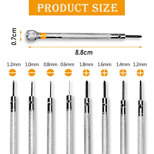 【Dimensioni Multiple】►8 Pezzi Cacciavite di precisione, di cui 4 cacciaviti a taglio, cioè 0,6 mm, 0,8 mm, 1,0 mm, 1,2 mm, e 4 cacciaviti a croce, tra cui 1,2mm, 1,4 mm, 1,6mm e 1,8 mm, una combinazione completa per soddisfare la maggior parte delle vostre esigenze di uso quotidiano.