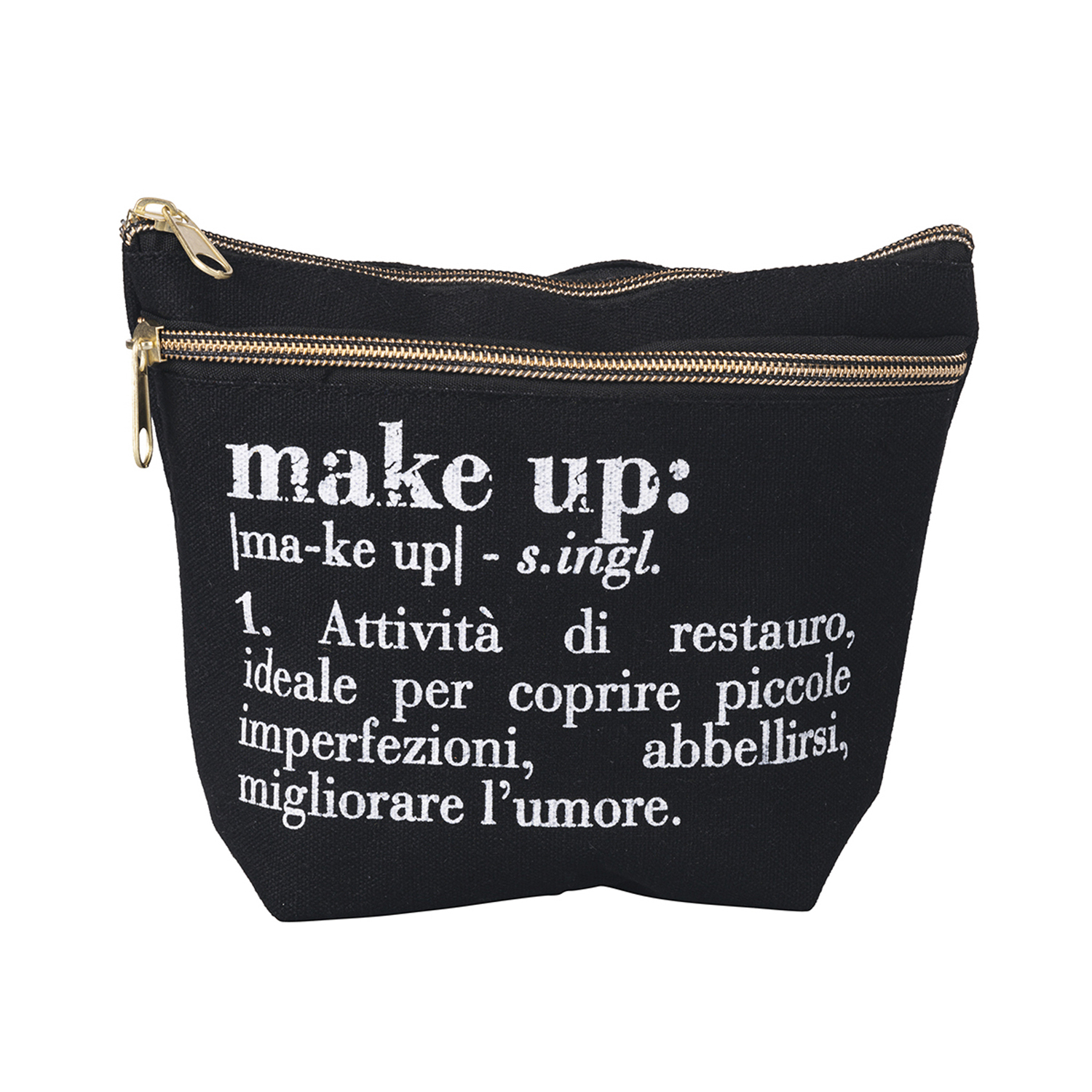 La linea Victionary, con il suo personale vocabolario, attribuisce ad accessori di uso comune un significato speciale che coniuga elementi di creatività e vita quotidiana. La definizione di make up stampata sui lati della pochette ti strapperà un sorriso ogni volta che ti trucchi. La bustina è realizzata in cotone e poliestere nero con scritte bianche. Si chiude con sistema a doppia cerniera color oro e all'interno è lavabile con spugnetta. Sarà una deliziosa idea regalo per mamme, amiche e colleghe che amano truccarsi! Misure: 20x8,5x14,5 cm.