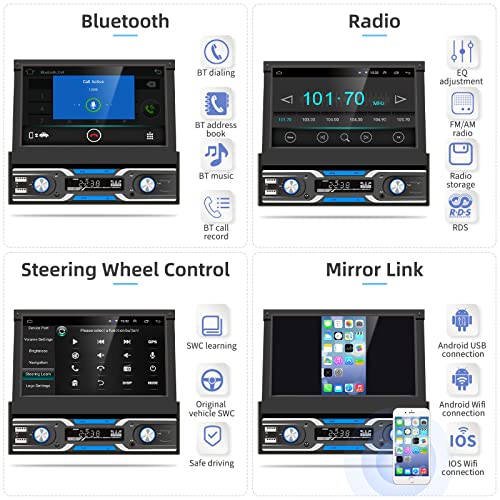 Autoradio 1 Din: autoradio con sistema operativo Android 9.1, touch screen capacitivo schermo HD da 7 pollici, garantisce un controllo fluido e preciso e gestisce l'unità principale proprio come il telefono. Con la chiamata in bluetooth vivavoce microfono integrato, ascolta musica/radio FM, questo dispositivo supporta anche mappe online e offline, sia che tu vada al lavoro o in viaggio, questa autoradio offre grande comfort e arricchisce la tua vita in auto.