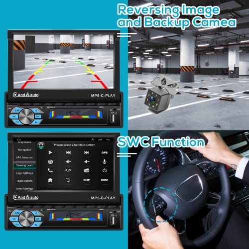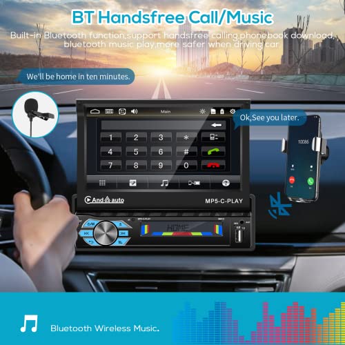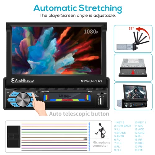 Podofo 1 Din Autoradio Apple Carplay Bluetooth 7'' Schermo a Scomparsa Mirror Link Telecamera Retromarcia a 8 led Bluetooth Vivavoce Radio FM e Ingresso MIC/AUX/USB/SD DVR Pulsante a 7 Colori