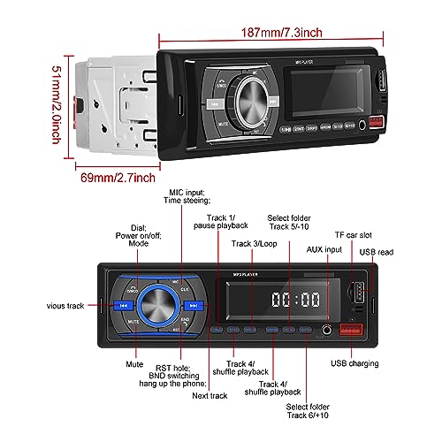 [1 Din MP3 Radio] - Dimensioni di installazione: 187 (L) * 51 (W) * 69 (H) mm. Supporta la ricarica del telefono cellulare USB, la scheda TF/SD, l'ingresso AUX, il controllo dell'APP mobile (Bluetooth), la riproduzione del disco U e il telecomando.