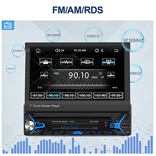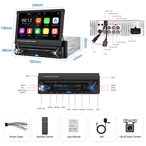 Podofo Autoradio CD/DVD 1 Din Carplay Android Auto Vivavoce Bluetooth con Schermo a Scomparsa Motorizzato da 7'' Radio FM/AM RDS Mirror Link AUX in +MIC + 12LED Telecamera Posteriore