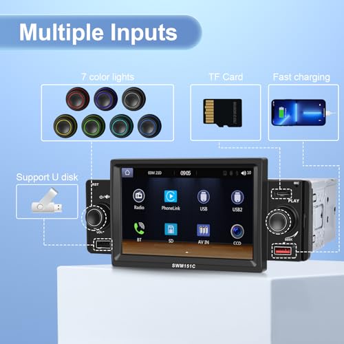 Podofo 1 Din Carplay Autoradio Con 5'' Touchscreen Bluetooth 5.1 2USB Android Auto Mirror Link Microfono/SD/USB/Equalizzatore/Controllo Del Volante 7 Pulsanti a Colori Con Telecamera Posteriore