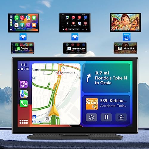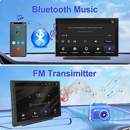 Podofo 9 Pollici Portatile Autoradio con Wireless Apple Carplay/Android Auto, Supporto Girevole 7-32V Touchscreen Schermo Musicale Bluetooth,AirPlay/Mirror Link/TF/USB/AUX+Cavo di Alimentazione