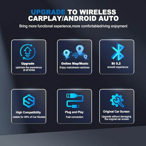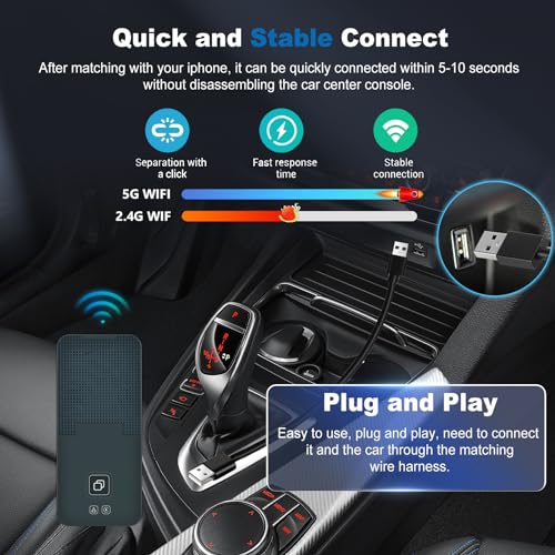 [Plug and Play, Connessione Rapida] - Facile da usare, basta collegare la scatola carplay/Androdi Auto cablata a quella wireless nella tua auto e, dopo l'abbinamento con il tuo Phone, puoi connetterti rapidamente in 5-10 secondi senza smontare la console centrale dell'auto.