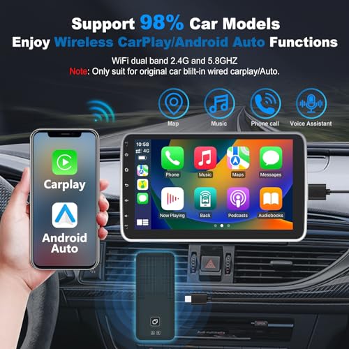 Android Auto & Apple CarPlay Cablato a Android Auto & CarPlay Wireless] - Con la scatola Android Auto/CarPlay cablata a wireless, è possibile collegare il telefono all'autoradio, evitando così ai conducenti di collegare e scollegare frequentemente i cavi dati o cercare porte USB durante la guida, migliorando notevolmente la sicurezza di guida. (Adatto solo per autoradio con Android Auto/Apple CarPlay cablato integrato nell'auto originale).