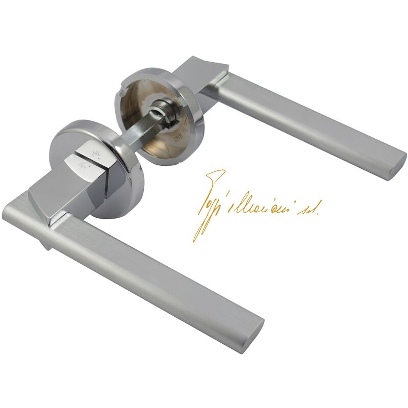 Maniglia per porte interne marca Poggi&Mariani, Caratteristiche tecniche: -Materiale: Ottone -Finitura Cromo Lucido/Cromo Satinato -Montata su rosetta mm. 50x10h La confezione comprende: - Coppia maniglie - Coppia bocchette per foro chiave mm. 50x10h - Coppia molle di ritorno - Ferro quadro 8x114 - Viterie ed accessori per montaggio. Prodotto disponibile in altre finiture e foro chiave/Yale e senza molle di richiamo cambiando la rosetta. Perchè scegliere POGGI & MARIANI SRL? La POGGI & MARIANI SRL nasce nel 1980 dall'esperienza pluriennale che i due soci fondatori hanno maturato in un piccolo laboratorio sui Navigli Milanesi. Qui, dove artigianalmente venivano fabbricati oggetti in ottone, col passare del tempo le maniglie conquistavano un ruolo sempre più importante nella produzione grazie alla passione e alla capacità creativa che veniva dedicata nella ricerca di forme, e stili, sempre nuovi e in linea con le esigenze del mercato . Spostando la produzione dal vecchio laboratorio