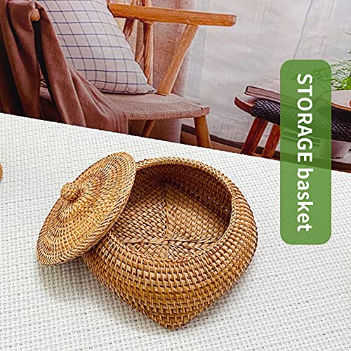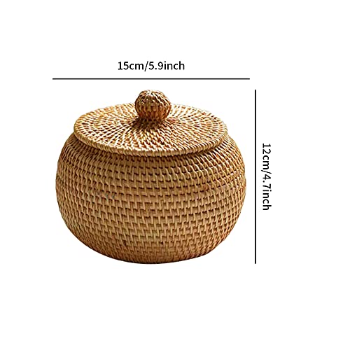 Pohove, Cesto in vimini con coperchio in rattan, cesto portaoggetti, organizer per scrivania, contenitore per frutta e verdura, rotondo, con coperchio (15 x 12 cm)
