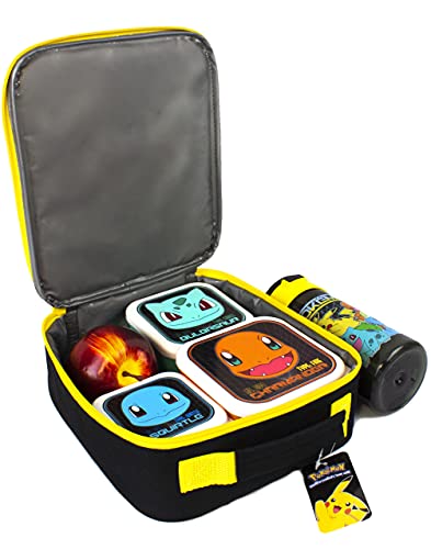 Pranzo leggero e pratico Set per la scuola - La borsa del pranzo Pokemon Pikachu è disponibile in nero e giallo e misura circa 24x21x8.5 cm e si adatta a una bottiglia e 3 contenitori alimentari all'interno. La bottiglia d'acqua libera della perdita BPA ha una cannuccia per un bere comodo. I 3 contenitori alimentari misurano 11.5x11.5x5.5cm, 10x10x5cm e 9x9x4.5cm Perfetto per panini, pasti o snack.