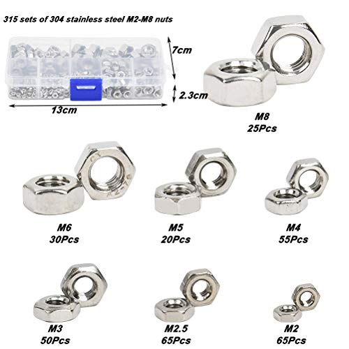 POKIENE 315 Pz Dadi Esagonali di Sicurezza, Distanziatori 304 Distanziatori Esagonali in Acciaio Inox Dadi di Bloccaggio, 7 Dimensioni M2, M2,5, M3, M4, M5, M6, M8