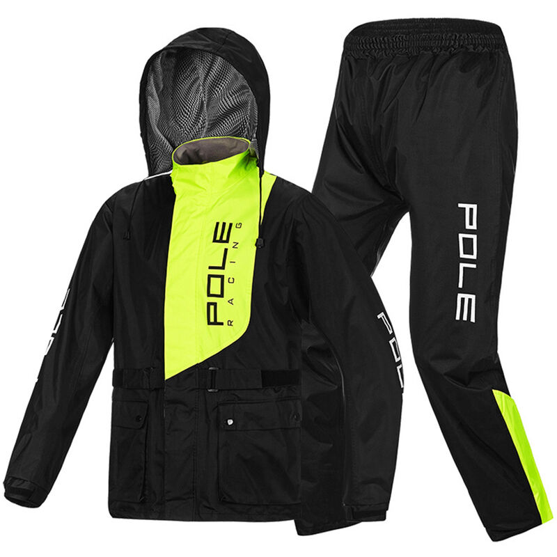 Questa tuta antipioggia è realizzata in poliestere pongee impermeabile e materiale in PVC che ti protegge da vento e pioggia. È dotato di cerniera a tutta lunghezza con colletto rialzato, patta antivento e cappuccio regolabile per fornire una migliore protezione, mentre la fodera in rete traspirante ti mantiene fresco e comodo. Gli elementi riflettenti aumentano la visibilità notturna e la sicurezza durante le attività notturne. La giacca antipioggia e i pantaloni sono molto utili per le attività all'aperto come motociclismo, escursionismo, pesca, corsa, campeggio, ciclismo. Caratteristiche: Guscio in poliestere di alta qualità con supporto in PVC impermeabile. Cerniera a tutta lunghezza con colletto rialzato e patta antivento adesiva. Cappuccio removibile e regolabile per una migliore protezione da pioggia e vento. Foderato in rete per migliorare la circolazione dell'aria interna e mantenerti fresco, asciutto e comodo. Le grandi tasche offrono un comodo spazio per riporre i tuoi