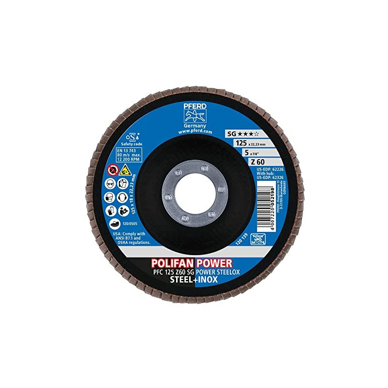 PFERD POLIFAN POWER Disco lamellare PFC, 2 pezzi, 125 x 22,23 mm, conico, Z60, linea SG STEELOX | 69398199 per acciaio e acciaio inox (INOX)