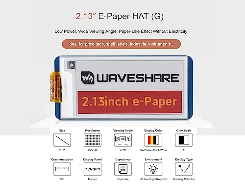2.13inch E-Paper HAT, red/yellow/black/white display color, 250×122 resolution, wide viewing angle, low power consumption, basically power is only required for refreshing