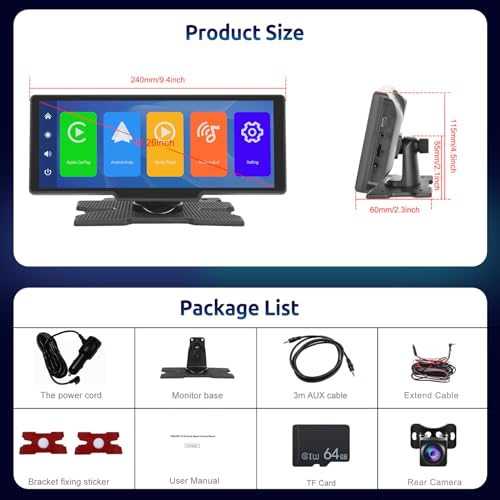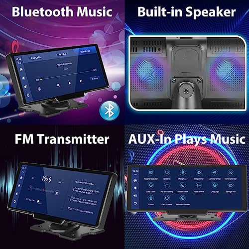 10,26 Pollici Monitor Bluetooth Apple Carplay Wireless Android Auto, Mirror Link Touchscreen Autoradio Portatile Schermo MP5 Lettore Carplay Dash Cam FM AUX, 7V-32V con Telecamera Posteriore+ 64GB SD