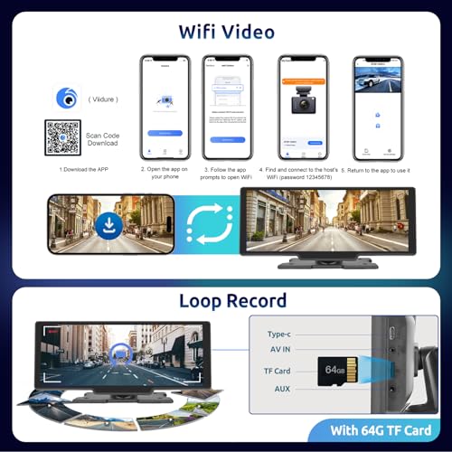 【Funzione di Videoregistratore e Telecamera Posteriore】 La dash cam per auto supporta la registrazione in loop. Quando la scheda SD è piena, il monitor sovrascrive automaticamente i video più vecchi con quelli più recenti. Scheda SD da 64 GB inclusa. Scarica l'app sul tuo cellulare per visualizzare i video registrati in modo sincrono. La dash cam con telecamera posteriore AHD inclusa contribuisce a migliorare la sicurezza, la telecamera supporta la visualizzazione dello specchio