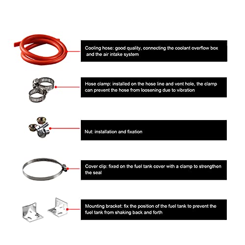 Compatibilità perfettail serbatoio di troppo pieno in lega di alluminio può adattarsi a tutti i veicoli. Il serbatoio di troppo pieno collegato al radiatore è sufficiente per catturare il liquido di raffreddamento traboccante.