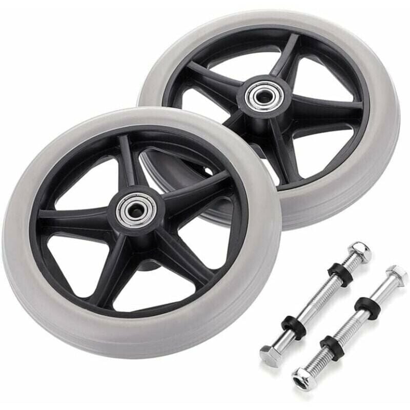La dimensione complessiva della ruota (diametro x larghezza) è 150 mm x 24 mm / 5,9 x 0,94, il diametro interno del cuscinetto centrale è 8 mm / 0,3, e la lunghezza dei bulloni dell'asse è 75 mm / 2,95. (Si prega di controllare le dimensioni dettagliate sulla terza foto prima dell'acquisto!!) Il pacchetto include 2 ruote di scorta anteriori grigie, 2 assi, facili e convenienti da installare senza passaggi complicati, risparmiando tempo e fatica. Realizzato in materiale in gomma di alta qualità ed ecologico, questo set di solide ruote di ricambio è antiscivolo e resistente alla polvere con una forte resistenza all'usura e capacità di carico. Ampia applicazione su veicoli per disabili, veicoli sanitari, ecc., Compatibile con la maggior parte delle sedie a rotelle, deambulatori, deambulatori o altri accessori di ricambio con ruote da 6. Questo set di sostituzione delle ruote anteriori fornirà una guida silenziosa, morbida e leggera su tutte le superfici, adatto per interni e uso esterno