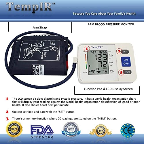 PORTATILE e CONVENIENTE: Con l'apparecchio digitale portatile da parte di TempIR sarai capace di in grado di riconoscere i cambiamenti della pressione in qualsiasi momento, sia in casa che fuori. Certificato, clinicamente testato e approvato, con cardiofrequenzimetro.