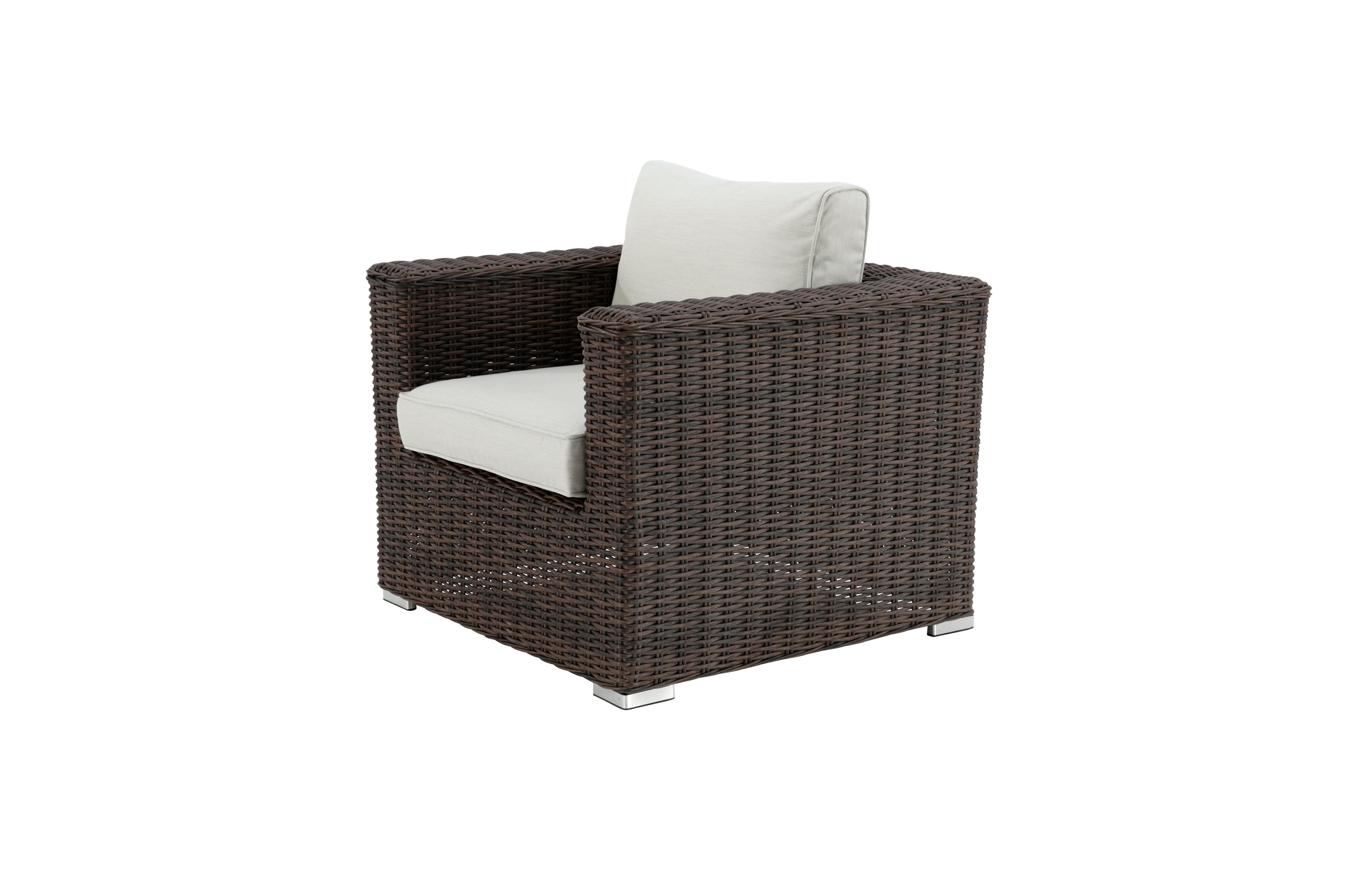 Struttura in alluminio, cuscino color marrone. Dim. L 82 x P 80 x H 69 cm. Confortevole e pratico, grazie ai cuscini inclusi, sfoderabili per garantire facilità di manutenzione. Prodotto già montato