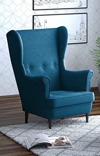Leo - Poltrona lounge con braccioli, in tessuto con piedini in legno, per orecchie e braccioli, con imbottitura, per sala da pranzo e soggiorno (blu, senza sgabello)