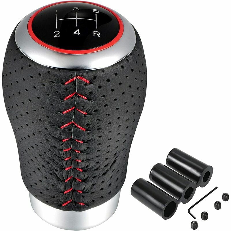 Leva del cambio universale in pelle nera per trasmissioni manuali e automatiche senza blocco/pulsante, cuciture rosse, sensazione di presa confortevole, solo per la sostituzione, parti per lo styling dell'auto, può aggiungere un tocco di moda di lusso ai tuoi veicoli. < p> Realizzato in pelle di alta qualità e leva in alluminio, misura universale per la maggior parte dei veicoli con pomello del cambio a vite, il pacchetto include: 1 pomello del cambio in pelle + 3 adattatori in plastica, non funziona per auto con blocco dei pulsanti o sollevatore posteriore, controllare il pignone prima dell'acquisto . Questo pomello del cambio ad alta resistenza dal design unico, non corrosivo, tolleranza alle alte temperature e bassa espansione termica, è una leva del cambio rossa che esalta la bellezza della tua auto e aiuta a migliorare le tue esperienze di guida. . Questo pomello del cambio rotondo in pelle si adatta a Volkswagen, Toyota, Mercedes, Hyundai, Suzuki, BMW, Buick Lexus Nissian, Audi