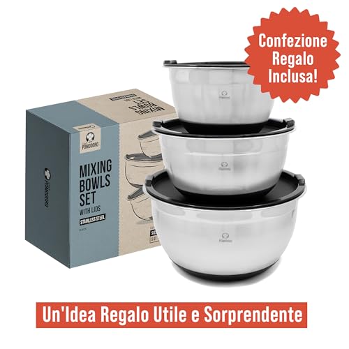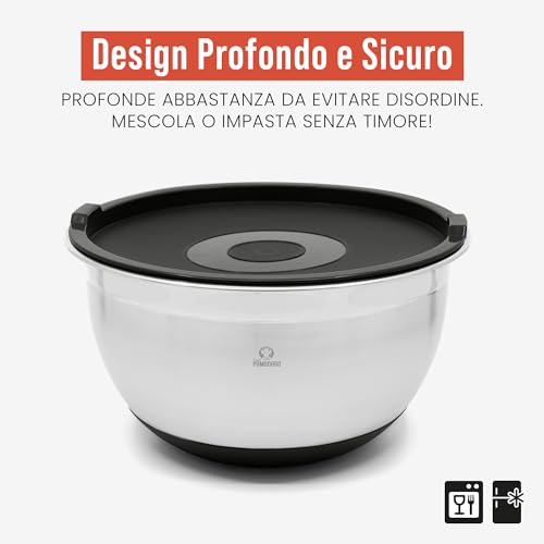Chef Pomodoro Set Ciotole Cucina con Coperchio (Confezione da 3-1,4 L, 2,8 L, 4,7 L), Ciotole Acciaio Inox Cucina con Base Antiscivolo, Ciotole con Coperchio per Insalata, Lievitazione (Nero)