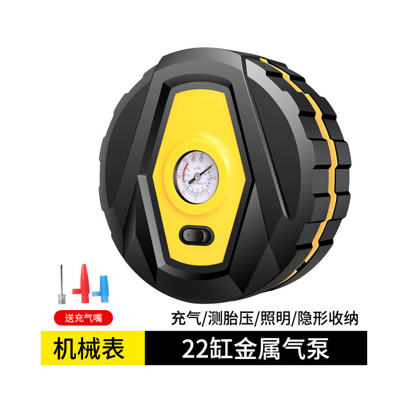 Nome prodotto - : pompa gonfiabile rotonda "Colore": nero e giallo "Stile prodotto": modello meccanico e modello digitale. Peso: circa 830g "Il prodotto include": pompa ad aria rotonda, 3 ugelli gonfiabili, manuale di istruzioni, scatola di imballaggio. [Taglia singola]: 8.5x18.5cm [Dimensioni scatola esterna]: 50x40x64.5cm