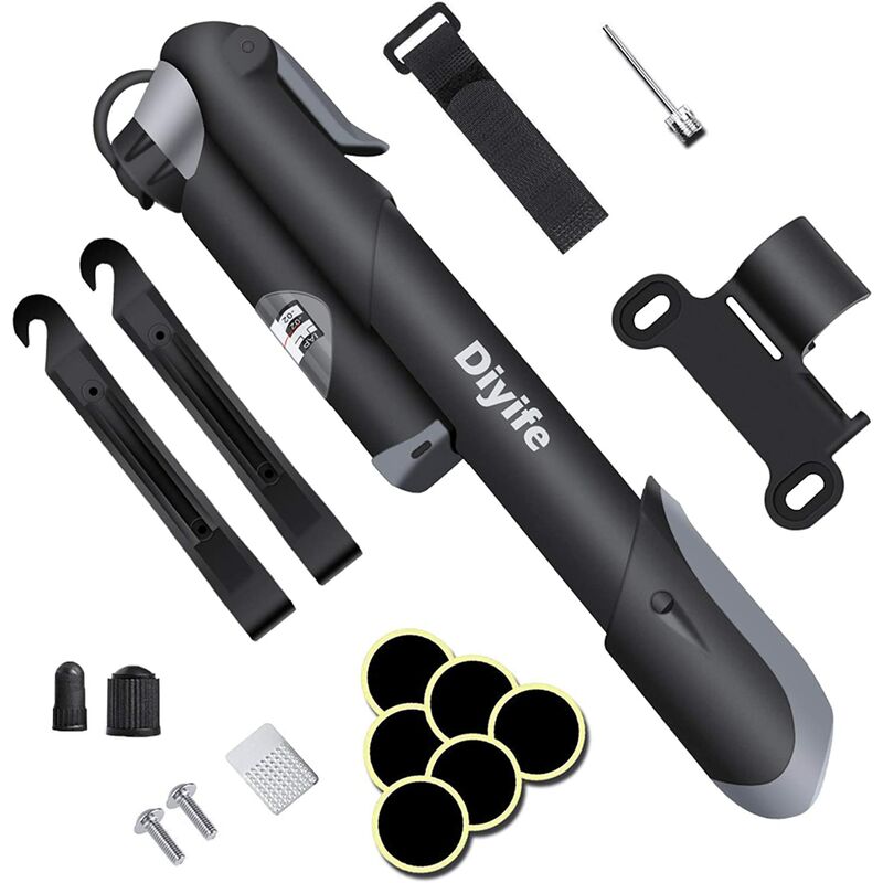 Come trovare 2 valvole - Presta e Schrader - Le 2 valvole si trovano all'interno della testa della pompa. Svita il cappuccio nero, tira la leva grigia sulla testa della pompa e le valvole all'interno verranno automaticamente espulse 【Gonfiabile rapido e manometro】 Con una capacità sufficiente, la bicicletta con mini pompa può essere utilizzata per gonfiare pneumatici per biciclette durante le riparazioni di emergenza o semplicemente per mantenere la pressione dei pneumatici nel corso di una stagione. Dotato di un manometro, è possibile osservare le variazioni di pressione dei pneumatici nel tempo durante il gonfiaggio. Ora puoi gonfiare il tuo pneumatico ovunque 【Ultra leggero e portatile】 È quasi senza peso (solo 160 g) ed estremamente compatto che può essere fissato al telaio della bici sotto il portaborraccia con staffa di montaggio 【Multiuso】 Viene fornito con un kit tascabile per la riparazione delle forature senza colla, nonché una staffa di montaggio per bicicletta e un ago per