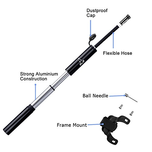 Portatile e resistente: 20,8 cm e 200 g, riponibile in tasca, in lega di alluminio resistente e gomma. Mini pompa SLB, con la nostra salda e sicura staffa di montaggio al telaio dotata di cinturino in velcro. Dei fori pre-forati nel telaio della bici sono necessari per l'installazione del supporto della pompa.