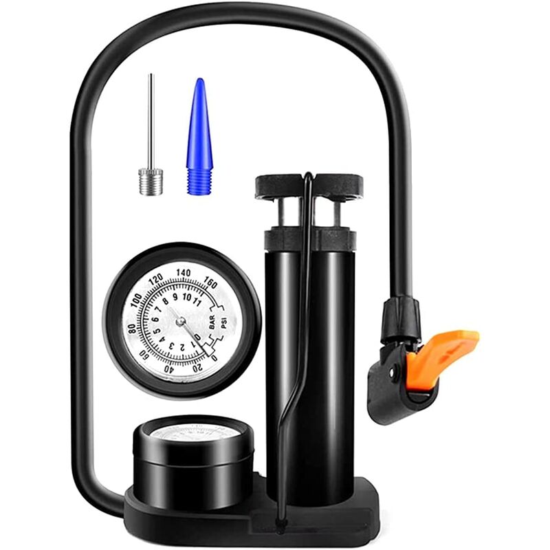 Mini pompa portatile: pompa da bicicletta La mini pompa da bicicletta pesa solo 402 grammi, la dimensione è 17,6 * 13,2 * 7 cm, pompa da bicicletta leggera in lega di alluminio, con valvola a sfera e ago dell'aria. Puoi semplicemente fissarlo sul telaio della bici o metterlo in una borsa da bici. Materiale durevole: questa mini pompa per bici è realizzata in lega di alluminio, il telaio è realizzato in plastica resistente e il telaio è realizzato di plastica resistente, che è più forte, più leggera e più durevole delle tradizionali pompe di plastica. Il tubo in PU da 50 cm non è solo resistente al gelo e alla corrosione, ma anche resistente al calore e all'alta pressione.Può ancora essere utilizzato normalmente in inverno. Design del pedale stabile: questa pompa a pedale portatile per bici è dotata di un pedale retrattile antiscivolo e manico pieghevole in plastica. Rispetto al tradizionale gonfiatore, la pompa a pedale non ha bisogno di piegarsi durante il gonfiaggio, può essere