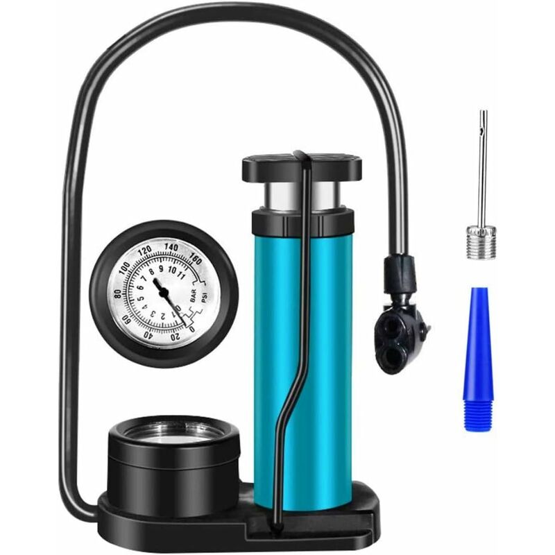 Max 60 PSI, previene lo scoppio accidentale del pneumatico. Il gonfiaggio a pedale è più economico e più robusto, più rapido e veloce. La pompa a pedale del manometro è compatibile con le doppie valvole Presta e Schrader. Non sono necessari adattatori o regolazioni, il blocco del pollice garantisce una tenuta perfetta e nessuna perdita d'aria. La pompa da bici a pedale piccolo pesa 400 g, solo un po' più pesante di due smartphone con schermo grande, portatile e leggero, facile da usare portalo nello zaino. La pompa da pavimento per bicicletta con manometro può gonfiare biciclette, palloni da calcio, palloni da basket, anelli da nuoto e giochi gonfiabili. Un ago per pallina sportiva e uno per gas inclusi. Fusto interno ed esterno in lega di alluminio. Superficie liscia. Il tubo in gomma della pompa portatile per bicicletta con manometro per bicicletta è staccabile.