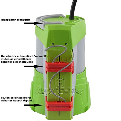 Pompa sommersa Agora-Tec AT per acque chiare 250W Vario-Control (1 mm di aspirazione piatta) interruttore a galleggiante regolabile in continuo con valvola di ritegno e max 0,4 bar e max 3000l/h