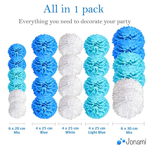 ★ QUANTITA' EXTRA - SET DELUXE ★ Troverai un totale di 24 elementi decorativi blu, bianchi e azzurri tra cui 6 pompon di fiori di carta di 30 cm, 12 pompon di fiori di carta di 25 cm e 6 pompon di fiori di carta di 20 cm.