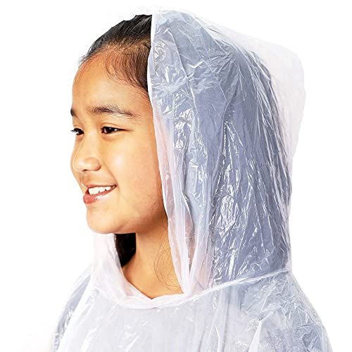 Include: (4) poncho antipioggia monouso per bambini con cappuccio in colore trasparente (trasparente), conservato nel proprio contenitore a clip. I colori del contenitore includono: giallo, nero, bianco e rosso.