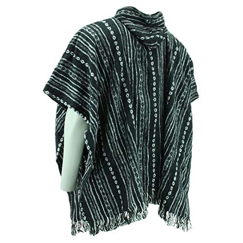 Poncho etnico in stile messicano con cappuccio in pesante cotone intrecciato con un morbido esterno spazzolato e fondo sfrangiato. Dispone di lati aperti con lacci in vita, tasca frontale a marsupio e bottoni in legno per fissare al collo.