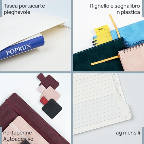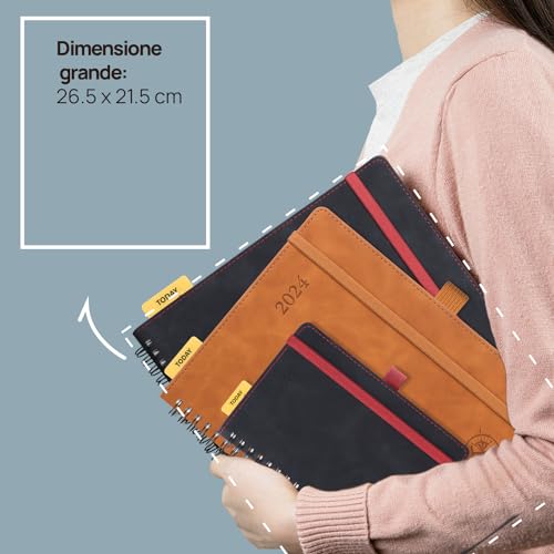 POPRUN Agenda Settimanale 2024 Spirale 26,5 x 21,5 cm, 1 Pagina a Settimana con 1 Pagina di Appunti, Righello Segnolibro, Copertina Morbida in Pelle PU, Carta da 100 gsm Certificata FSC®, Nero