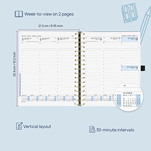 POPRUN Premium Agenda Settimanale Verticale 2022 con spirale 26,5 x 21,5 cm - Carta Spessa da 100 gsm, Schede Mensili, Tasca Interna, Copertina Rigida