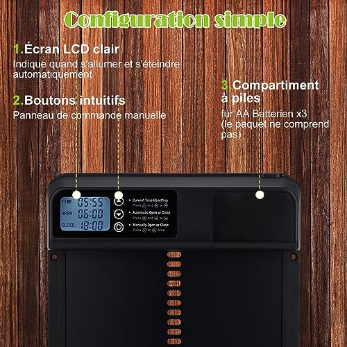 DISPLAY INTUITIVO - La porta automatica pollaio è dotata di un display chiaro e di pulsanti di controllo di facile comprensione. Lo schermo si illumina quando si utilizzano i pulsanti, in modo da non doversi preoccupare anche nelle notti buie.