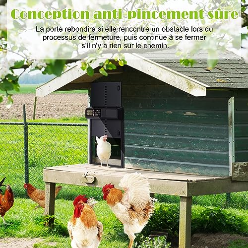 Protezione intelligente - I sensori incorporati assicurano che la porta automatica della stalla abbia una funzione antipizzicamento. Se la porta incontra un ostacolo durante la chiusura, smette immediatamente di chiudersi e attiva il meccanismo di protezione dal rimbalzo.