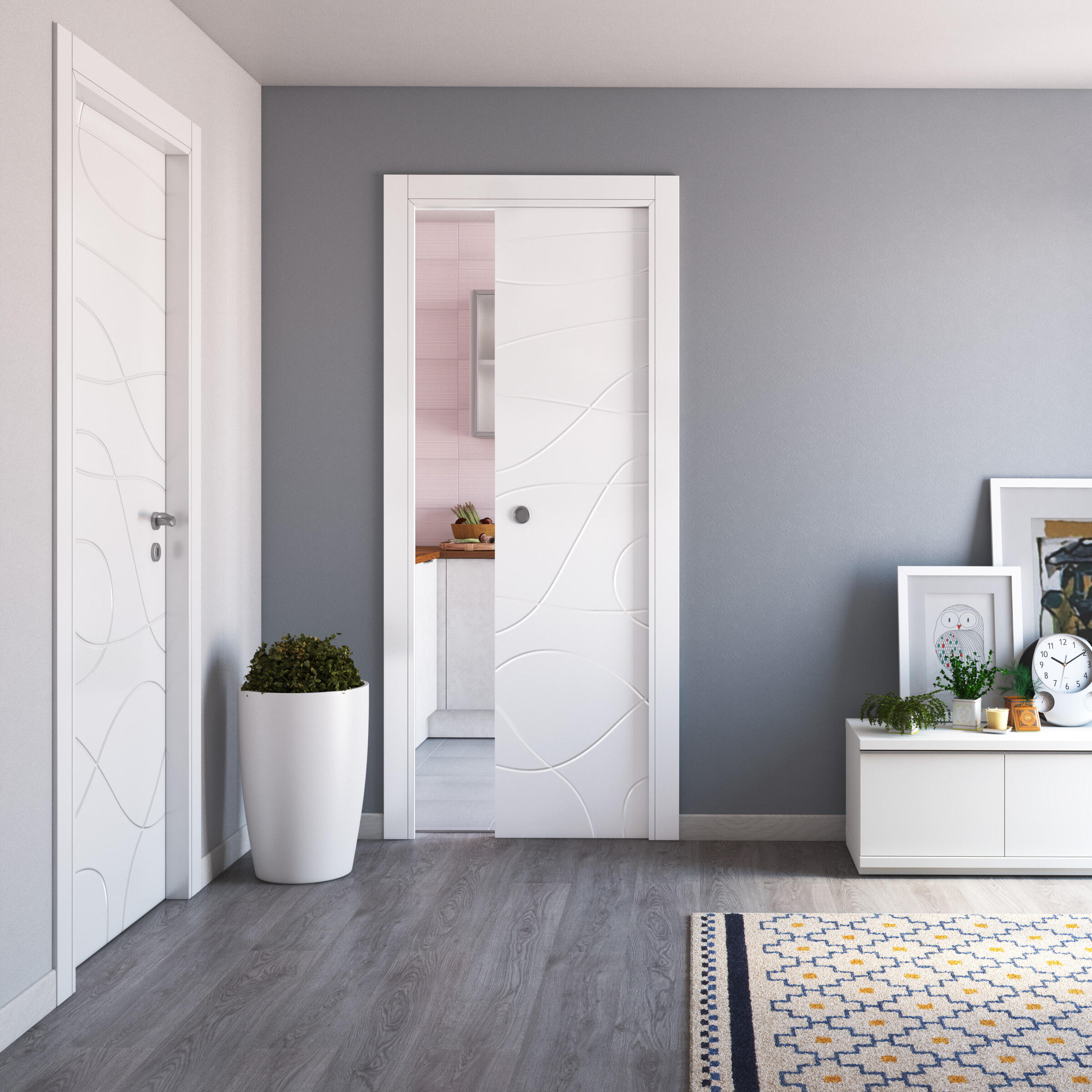 Laccata, incisa, telaio dritto, coprifili ad incastro. Maniglia da acquistare separatamente. Qualità Premium, porta raffinata che si distingue per la ricchezza del design. Ideale per personalizzare ambienti eleganti e di prestigio. Apertura comoda e funzionale. La laccatura dona una finitura di prestigio al tatto e alla vista. Anta incisa rende la porta unica e personale