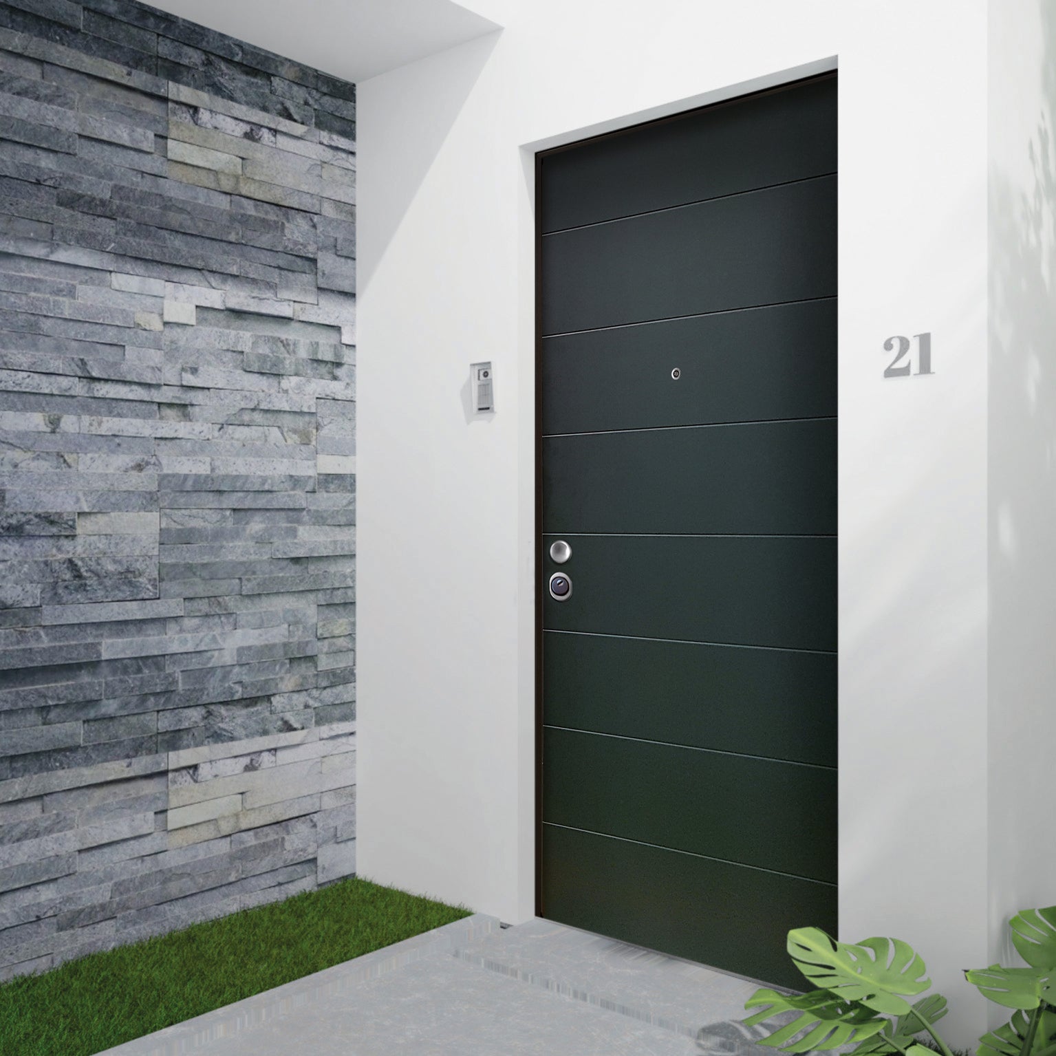 Pannello esterno pvc pellicolato verde scuro, classe di sicurezza 2, serratura cilindro europeo con defender, punti di chiusura 7. Consigliata per appartamenti posti all'interno di un condominio. Pannello indicato per ingressi situati in ambienti esterni esposti alle intemperie. Protezione antitrapano grazie alla serratura con defender