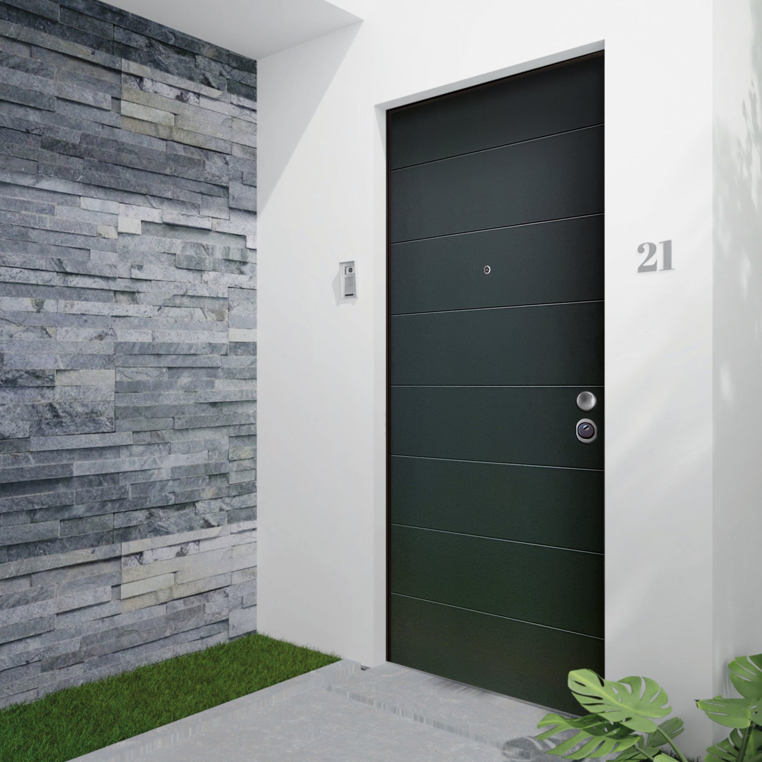 Pannello esterno pvc pellicolato verde scuro, classe di sicurezza 2, serratura cilindro europeo con defender, punti di chiusura 7. Consigliata per appartamenti posti all'interno di un condominio. Pannello indicato per ingressi situati in ambienti esterni esposti alle intemperie. Protezione antitrapano grazie alla serratura con defender